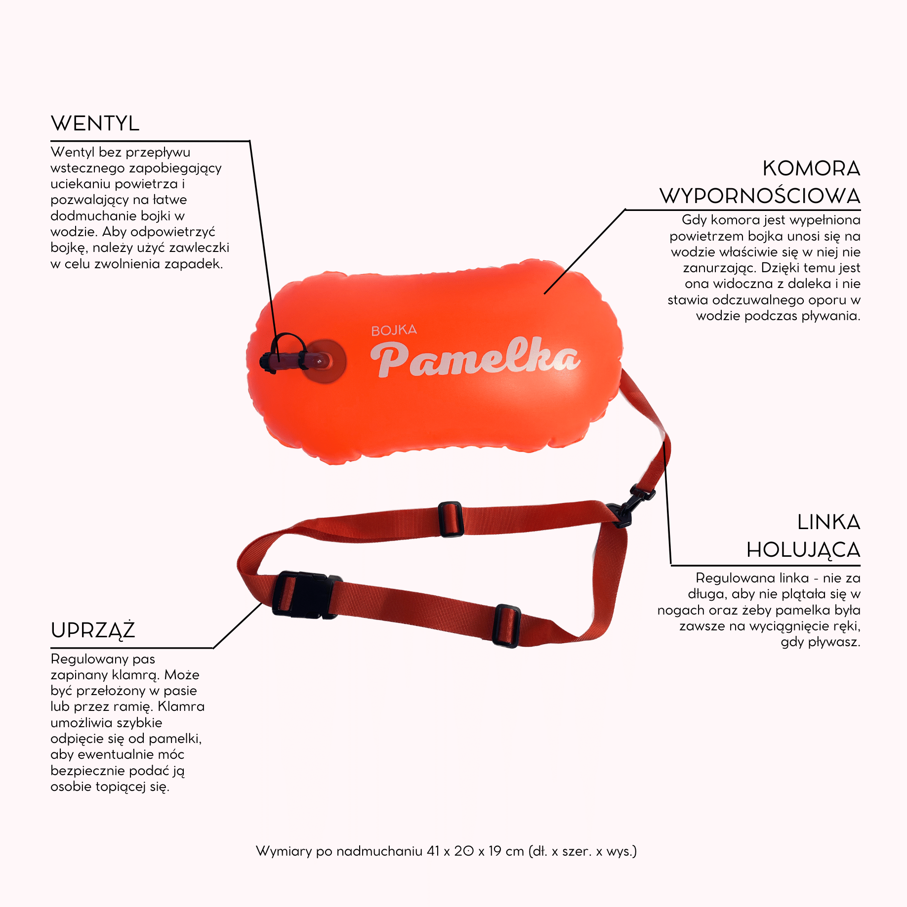 Dzięki regulowanym linkom pamelka nie krępuje ruchów w trakcie pływania, nie plącze się w nogach - masz ją cały czas na wyciągnięcie ręki, aby móc się na niej wesprzeć. Model #BasicPam ma regulowaną w pasie uprząż - od 75 do 135 cm obwodu oraz regulowaną linkę holującą - do 43 cm.